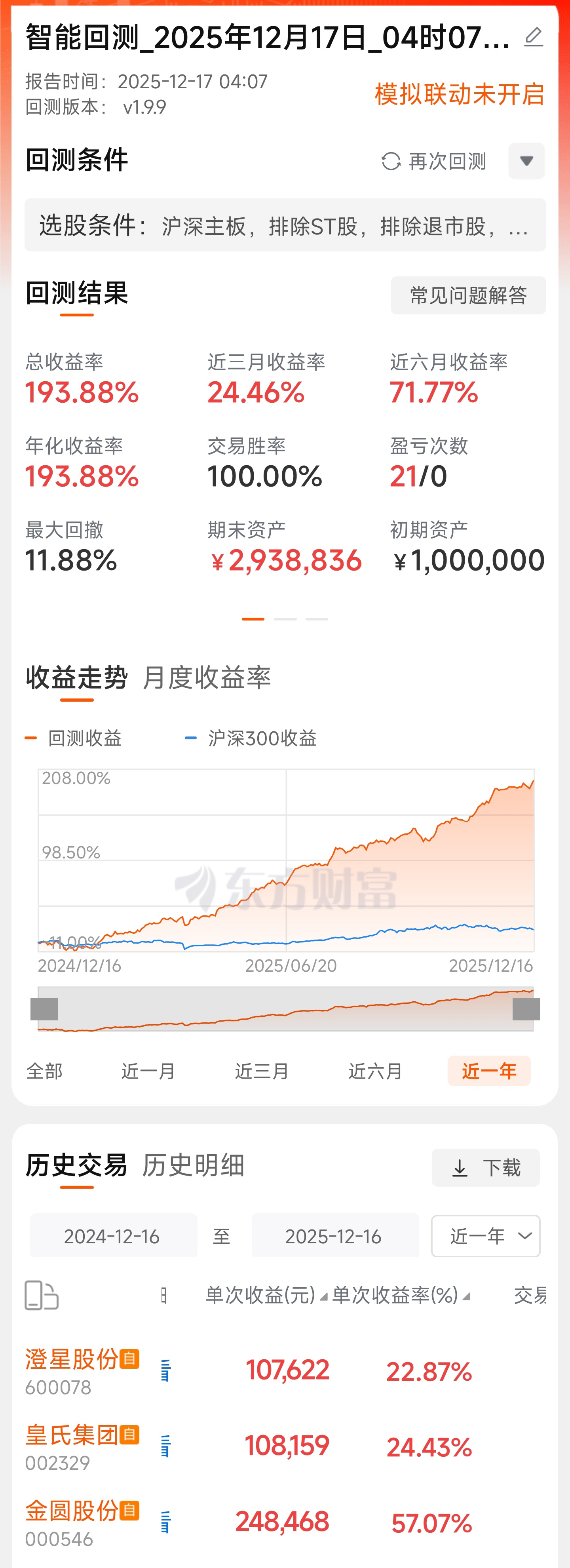 长线策略五 ,持股最长时间120天,回测胜率如下,最近抓到过皇氏集团,金圆股份等,而且之前11月22号就根据这个预测过双星新材 皇氏集团大概率会大涨,如今果然应验。由于规则不能荐股,只能设置私密文字,再一次验证了长线策略五的厉害之处。几个比开始阴阳怪气了,拿个破策略来攀比