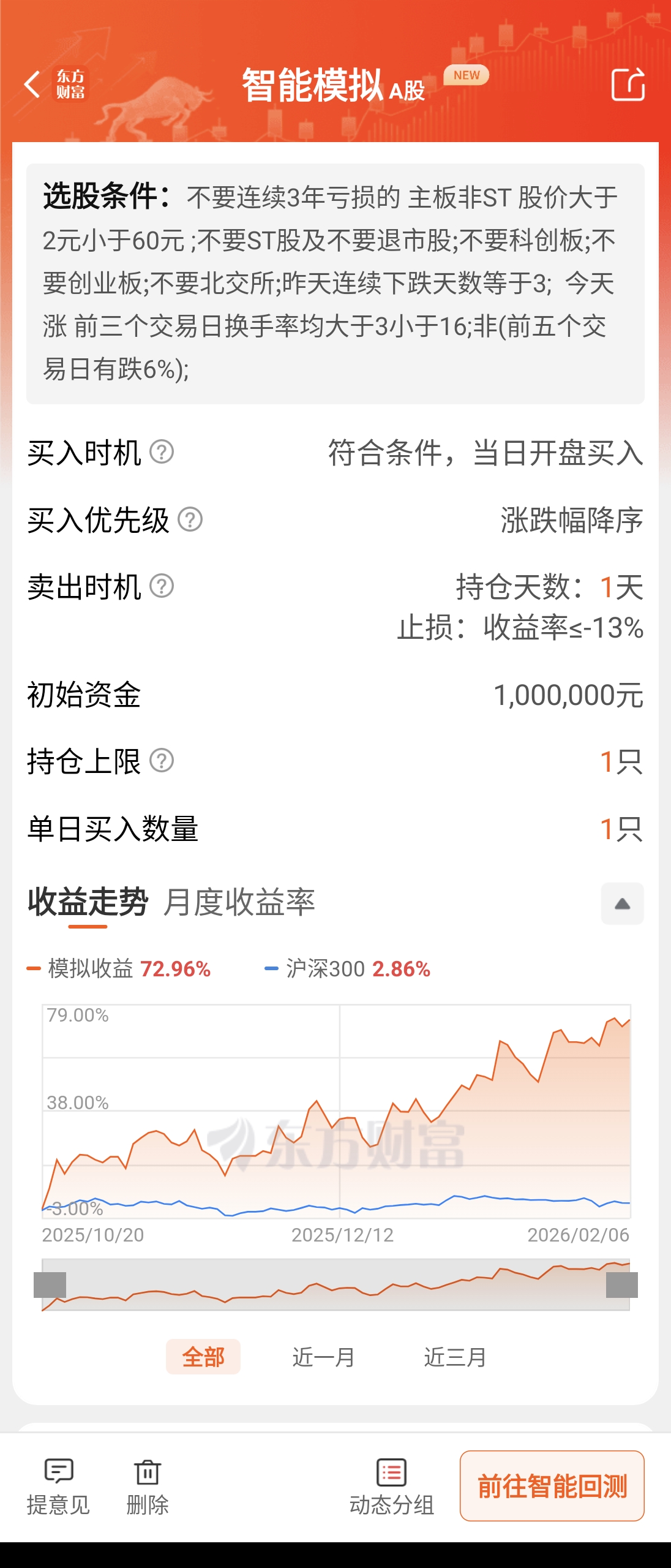 三连阴策略模拟都跑出72个点了,虽然回测有一个未来函数,但模拟却跑的很好而且曲线