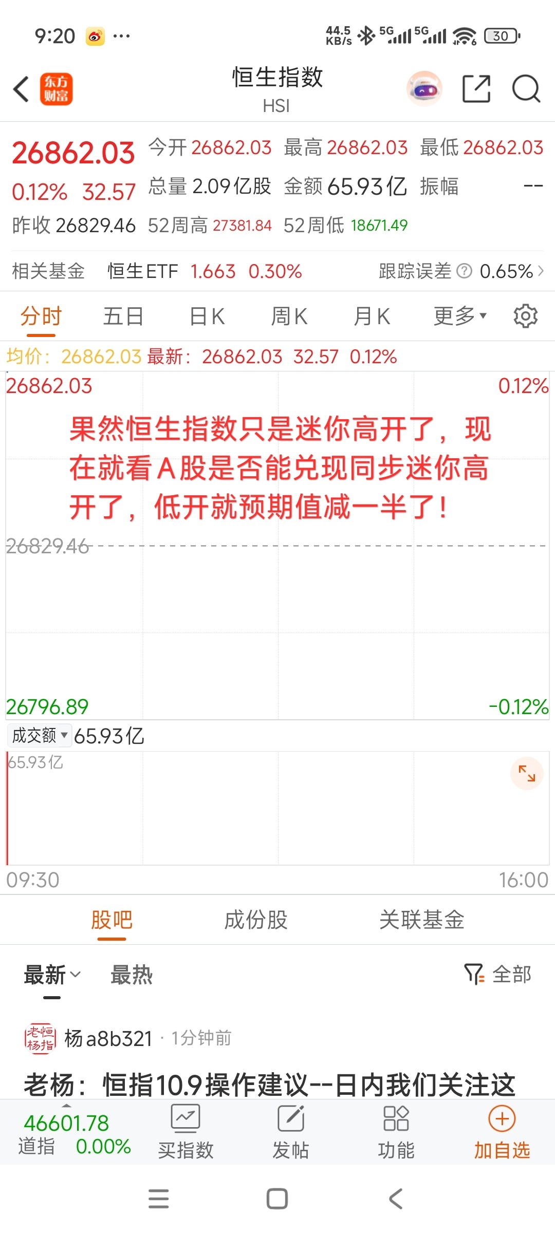 果然恒生指数只是迷你高开了,现在就看A股是否能兑现同步迷你高开了,低开就预期值减一半了!