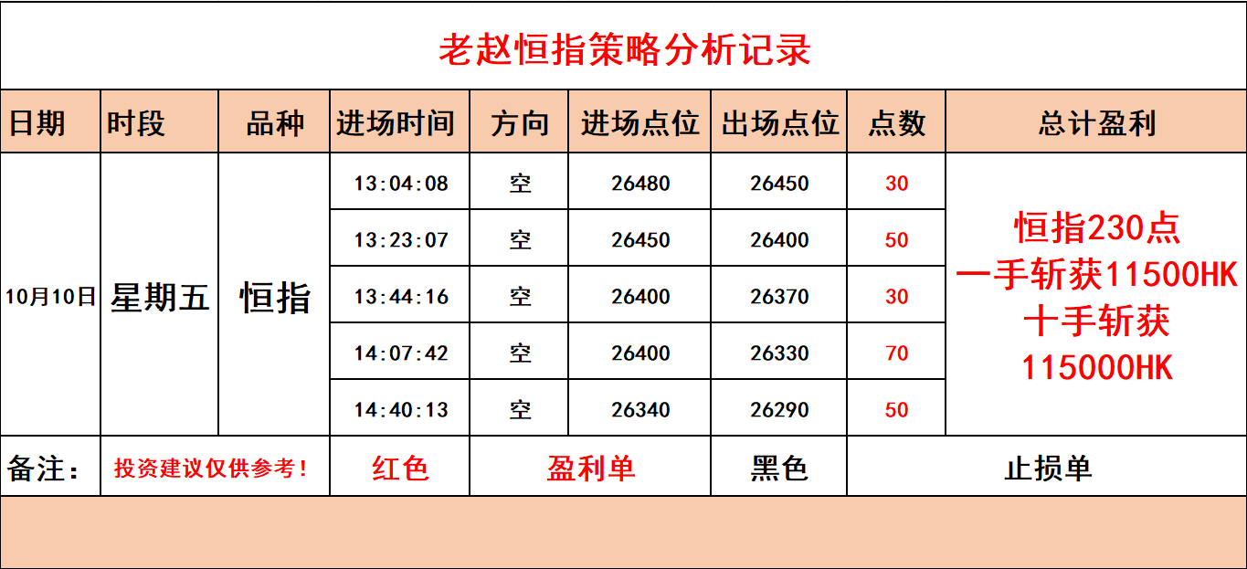 【老赵恒指】10月10日星期五白盘实战记录!狂斩230点,收官!
