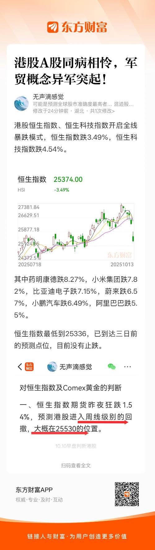 其中药明康德跌8.27%,小米集团跌7.82%,比亚迪电子跌7.15%,蔚来跌6.57%,小鹏汽车跌6.49%,阿里巴巴跌5.5%。