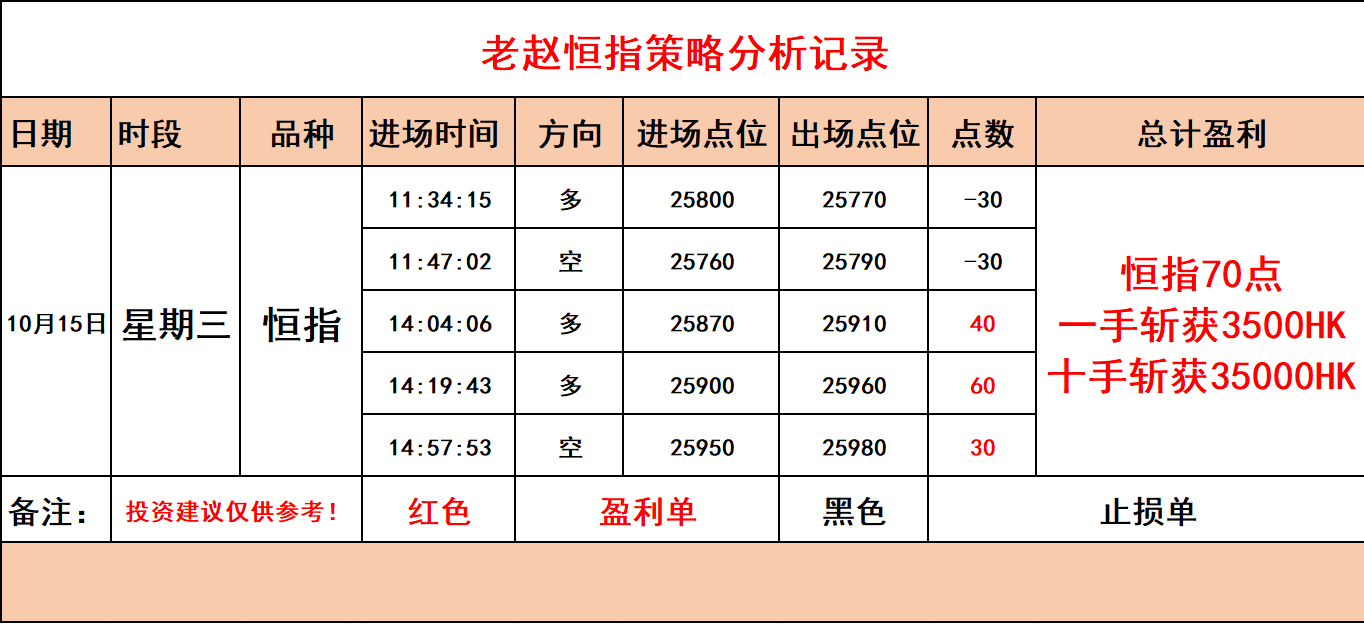 【老赵恒指】10月15日星期三,白盘指导操作实况!斩获70点