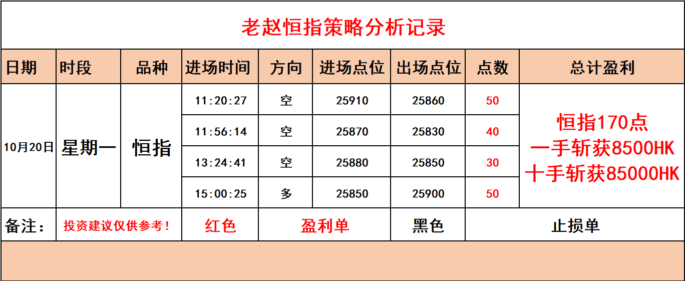 【老赵恒指】10月20日恒指白盘实盘指导记录!斩获170点!
