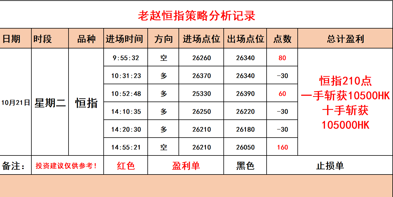 【老赵恒指】10月21日星期二,白盘实盘指导记录!斩获210点!