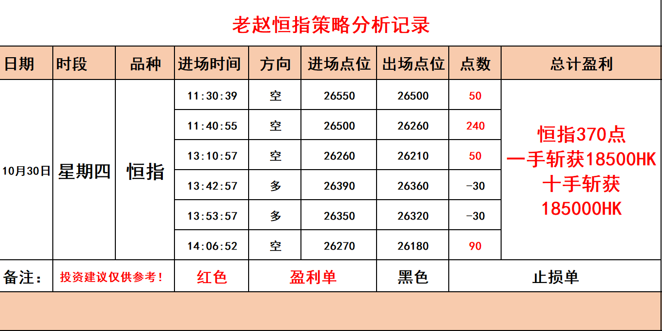 【老赵恒指】10月30日恒指实盘指导记录!斩获370点!