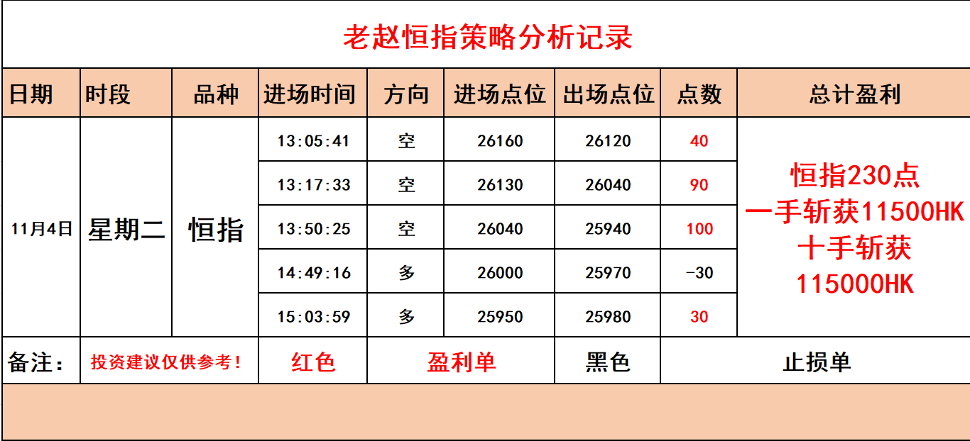 【老赵恒指】11月4日白盘实盘指导操作记录!斩获230点!