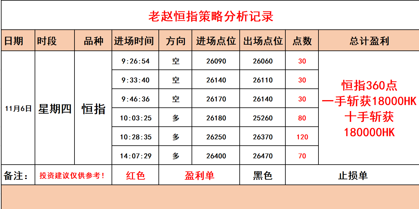 【老赵恒指】11月6日星期四恒指全天实盘指导记录!斩获360点!