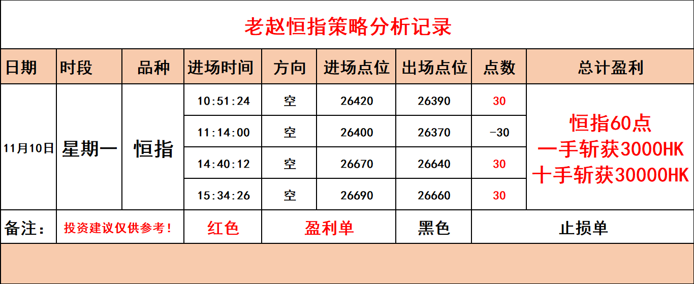 【老赵恒指】11月10日星期一白盘实盘操作记录!