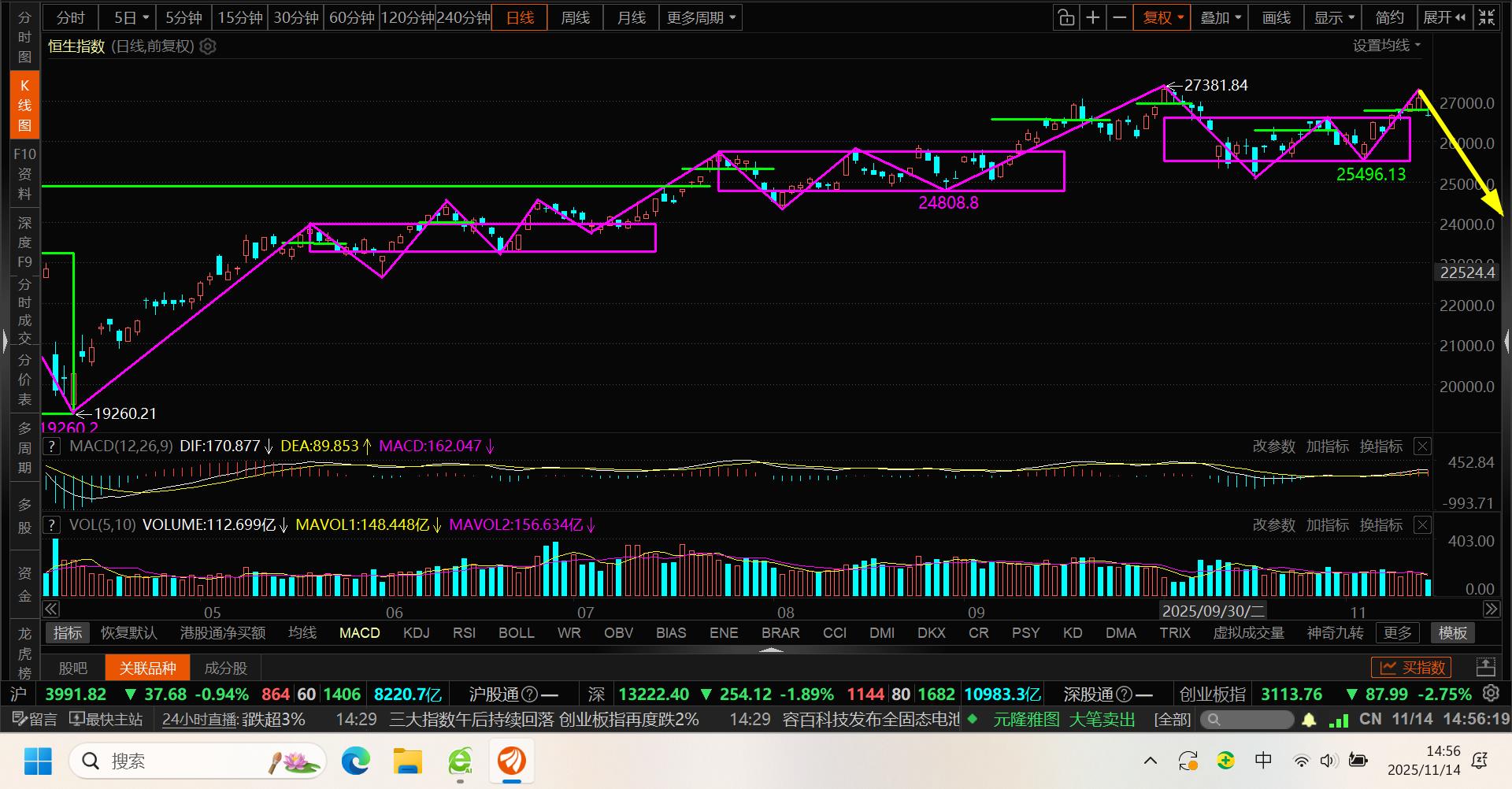 11月14日,港股今日走出共振下跌走势,恒生指数日线大3浪下跌要来了,砍了所有港