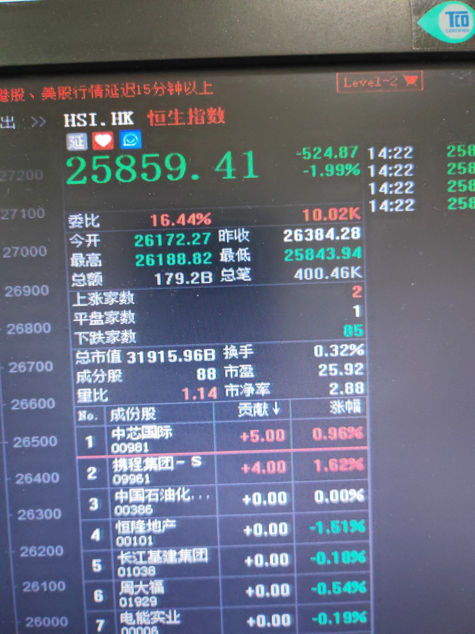 $恒生指数(QQZS|HSI)$ 30分钟周期上,布林带上轨还没有出现朝下的碗口,现在25847,还要跌,又一个500点
