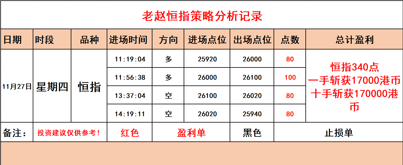 老赵恒指11月27日白盘实盘指导记录,狂斩340点!