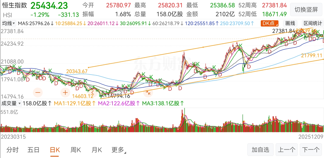 $恒生指数(QQZS|HSI)$ 小弟不才,趋势线画得对吗?是不是要回踩了?