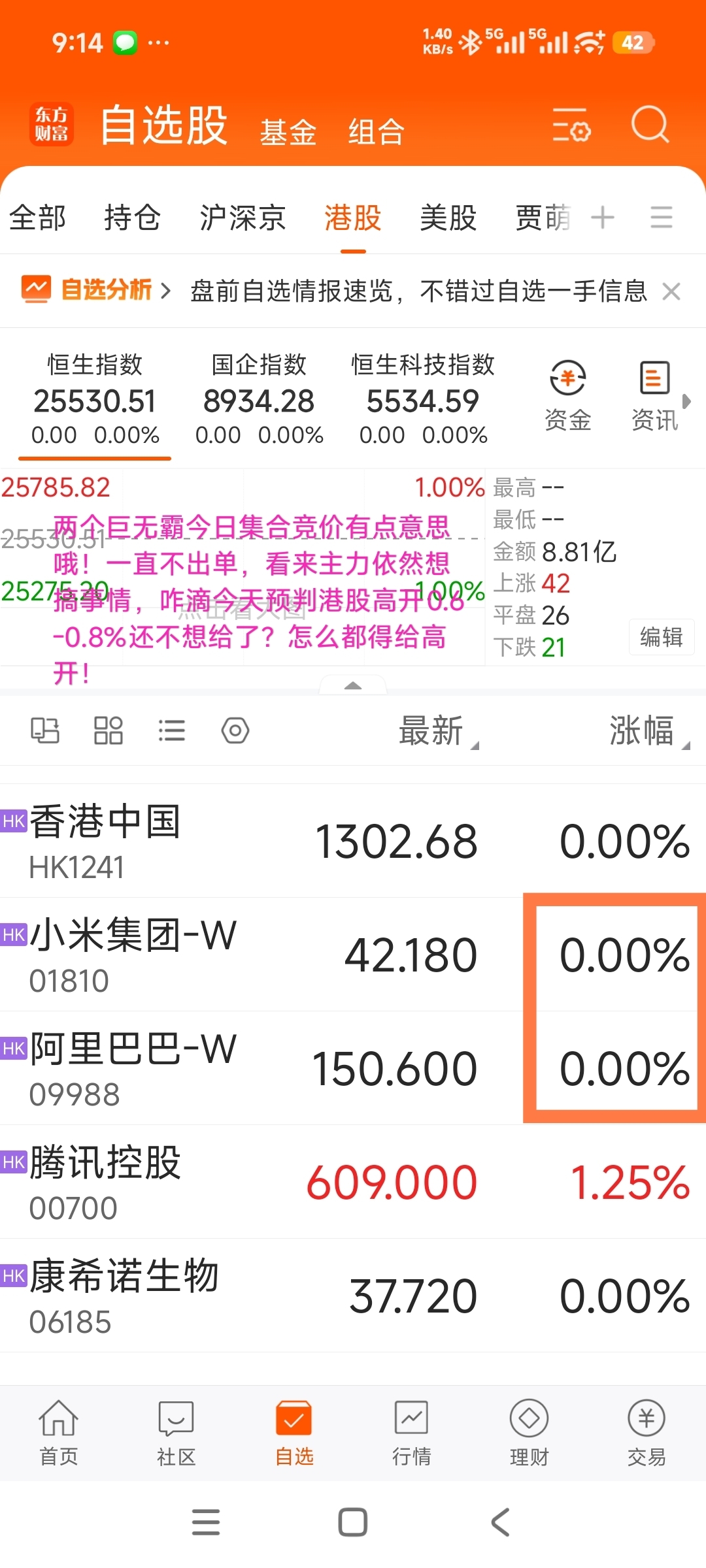 $恒生指数(QQZS|HSI)$ 两个巨无霸今日集合竞价有点意思哦!一直不出单,看来主力依然想搞事情,咋滴今天预判港股高开0.6-0.8%还不想给了?怎么都得给高开!