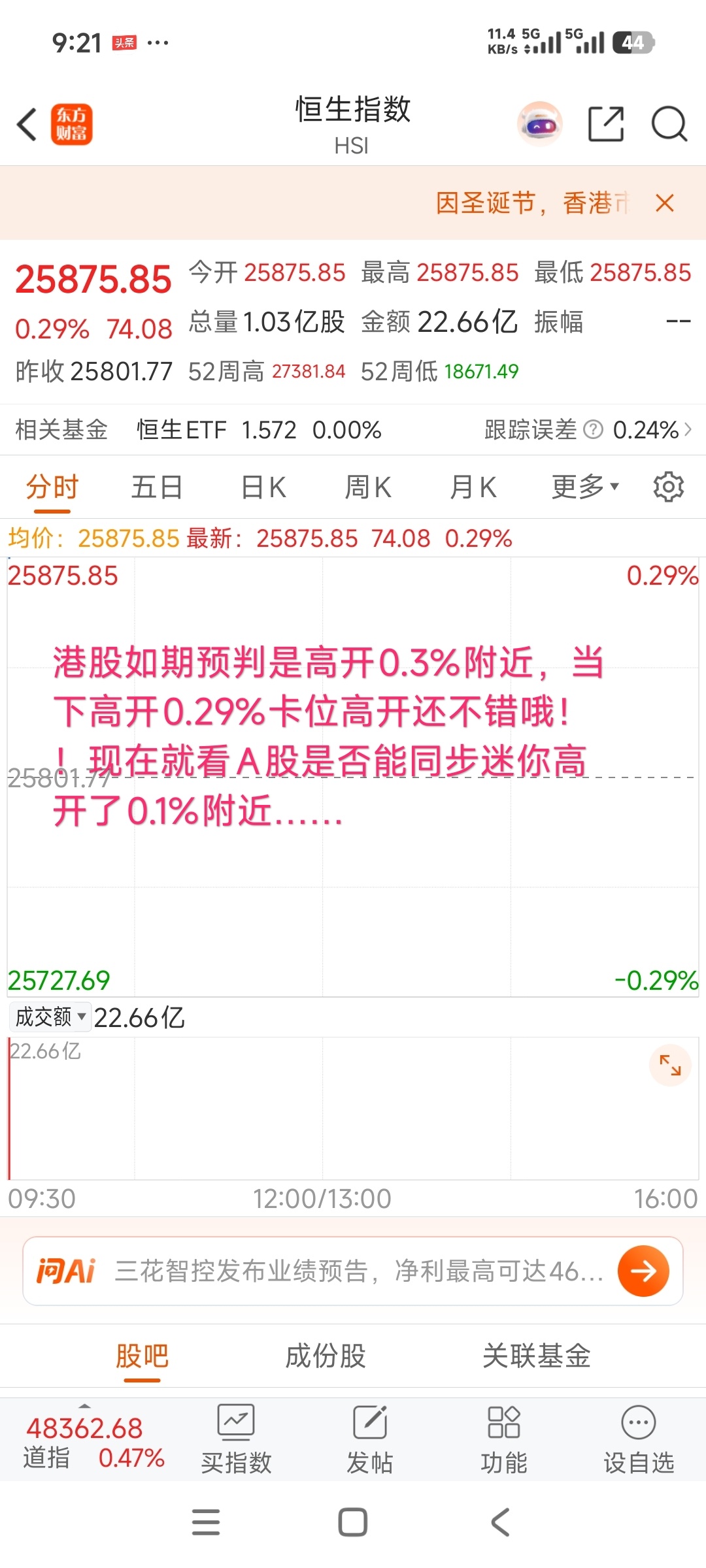 $恒生指数(QQZS|HSI)$ $上证指数(SH000001)$ $东方财富(SZ300059)$ 继续小小高开呗!A股也是一样,高开比低开强了!!!迷你高开也是高开哦!