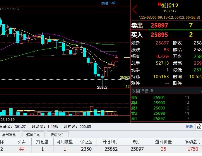 $恒生指数(QQZS|HSI)$ 恒指25862多单,1手盈利1750港币