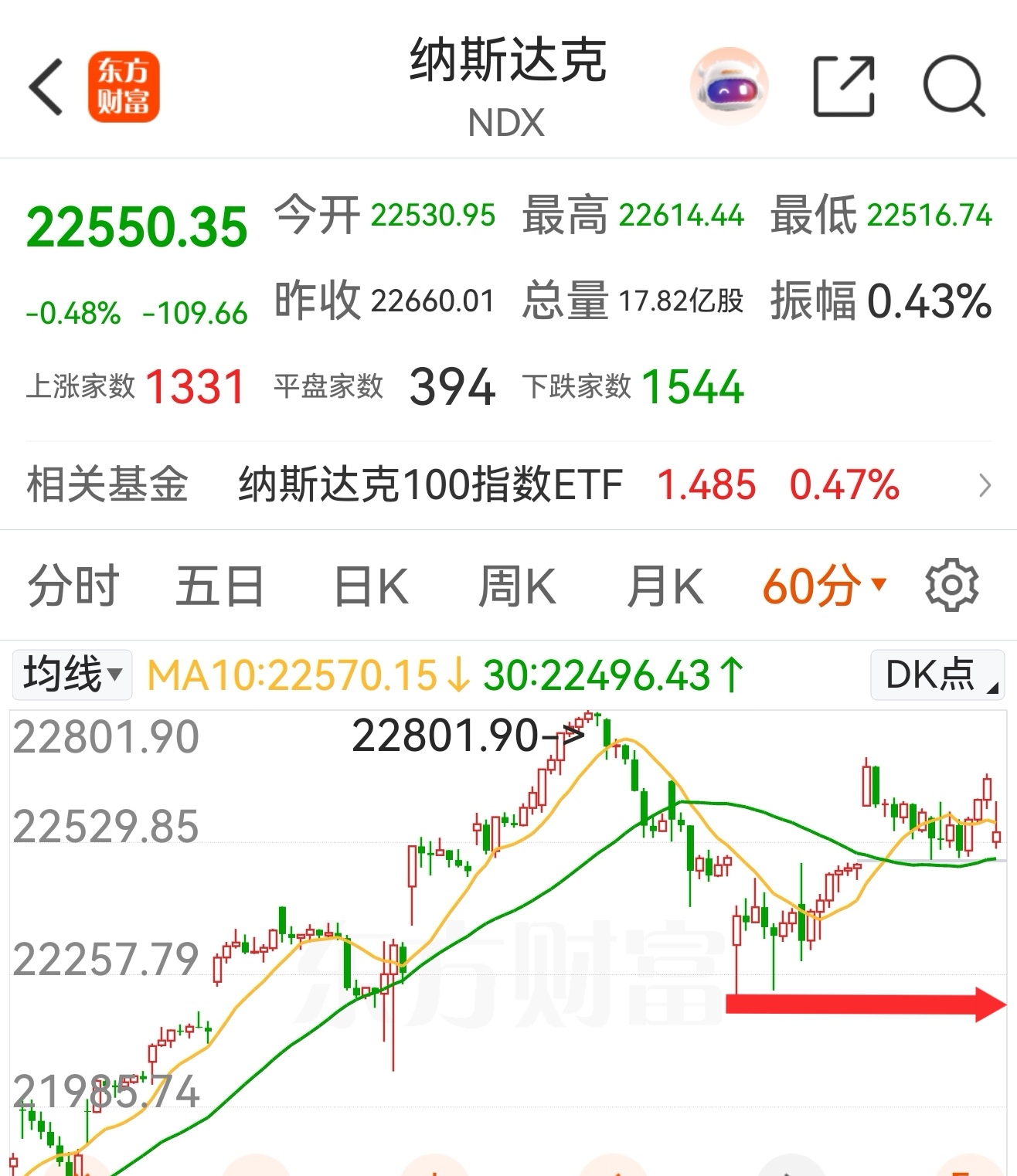 很久没有跟进美股了,闲着无事看了一下纳斯达克指数,60分钟前低22185大概率会破,也就是图中的红色箭头处。