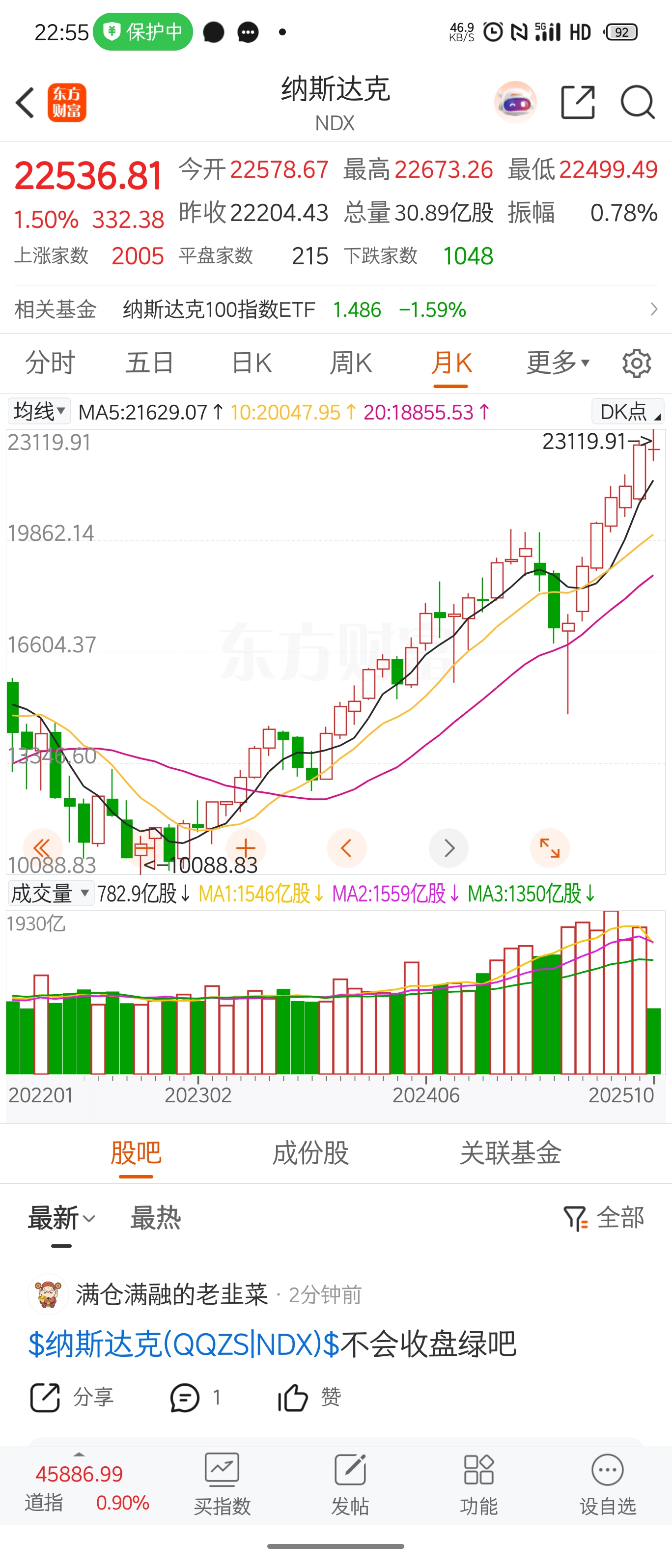 $纳斯达克(QQZS|NDX)$ 从月线来看。高位十字星。接下来。漫长雄市