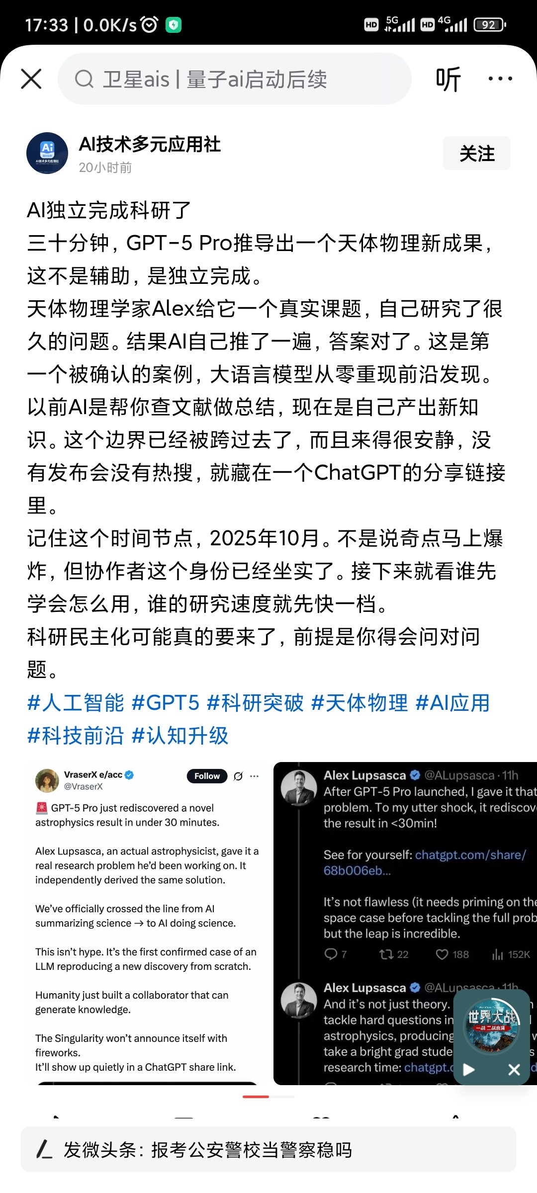 三十分钟,GPT-5 Pro推导出一个天体物理新成果,这不是辅助,是独立完成。