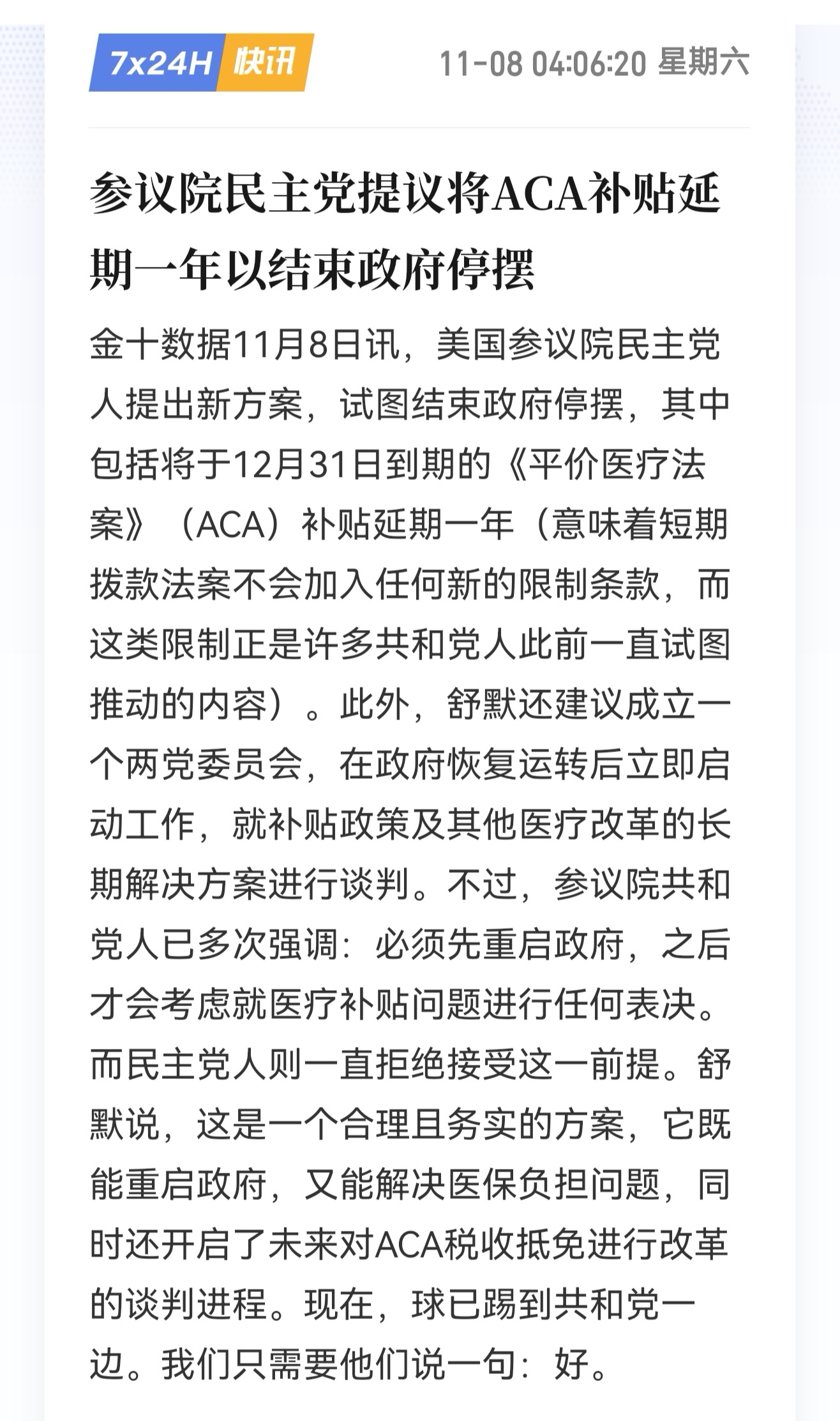 参议院民主党提议将ACA补贴延期一年以结束政府停摆