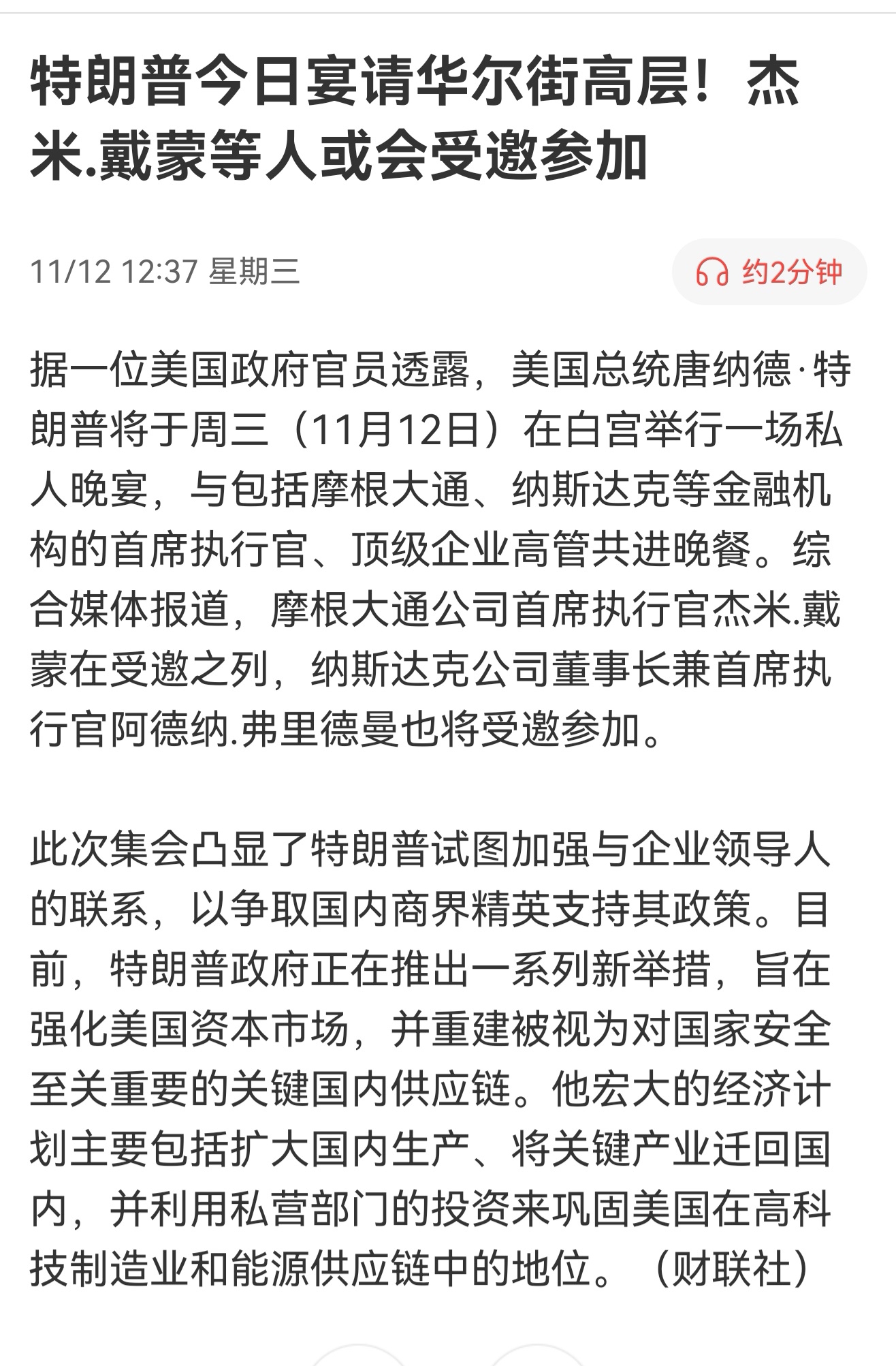 特朗普今日宴请华尔街高层!杰米.戴蒙等人或会受邀参加