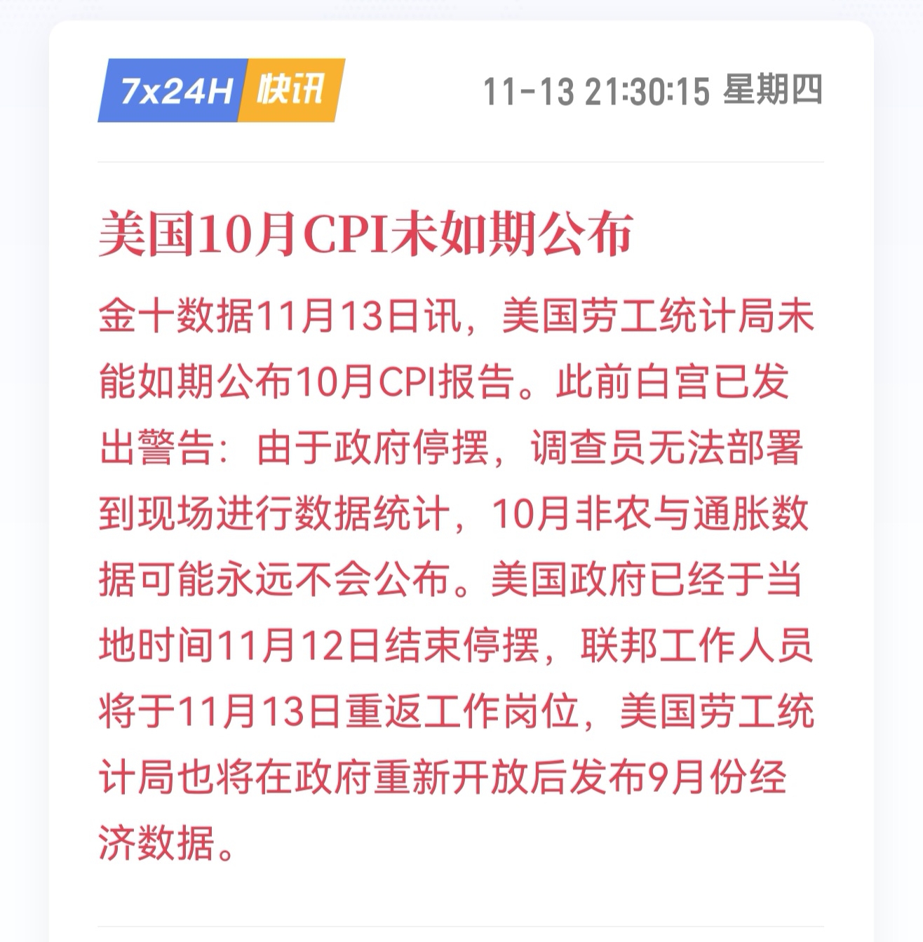 美国10月CPI未如期公布