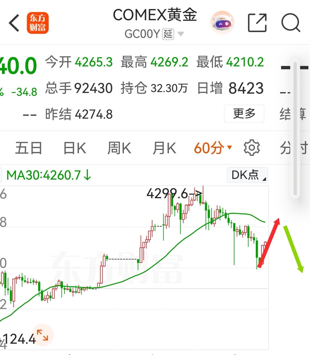 Comex黄金60分钟反弹不过4258后,会再下或破4210,所以区间是4210∽4258。
