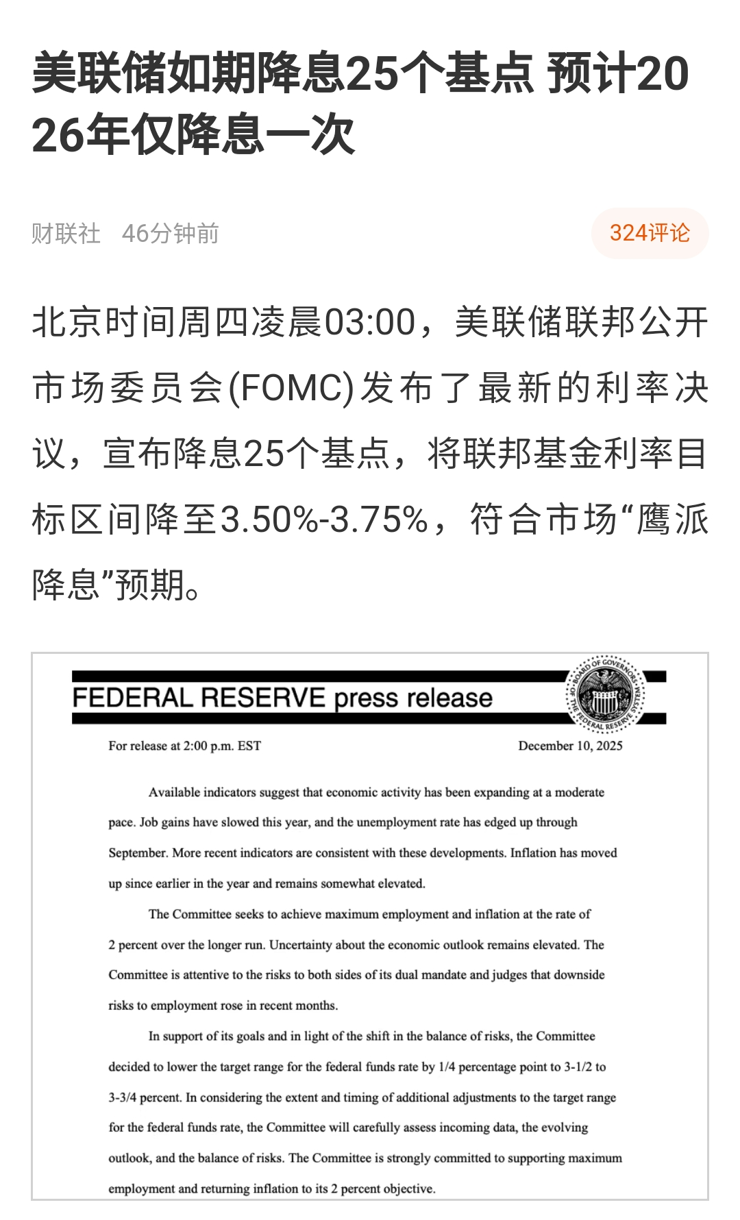 $纳斯达克(QQZS|NDX)$ 美联储宣布降息25基点!