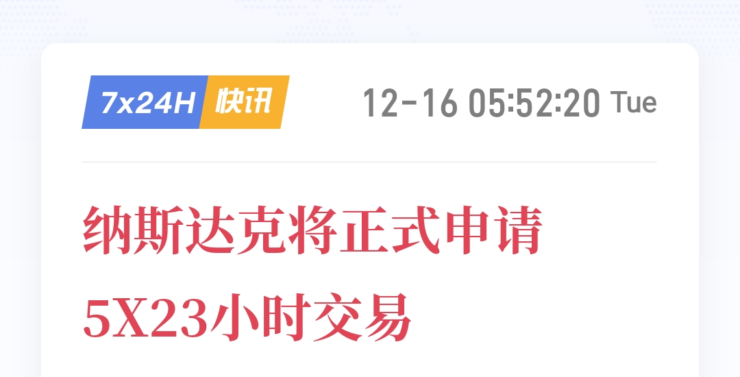 $纳斯达克(QQZS|NDX)$ 纳斯达克将申请每天23小时交易时长,也就是每天只休市1小时。