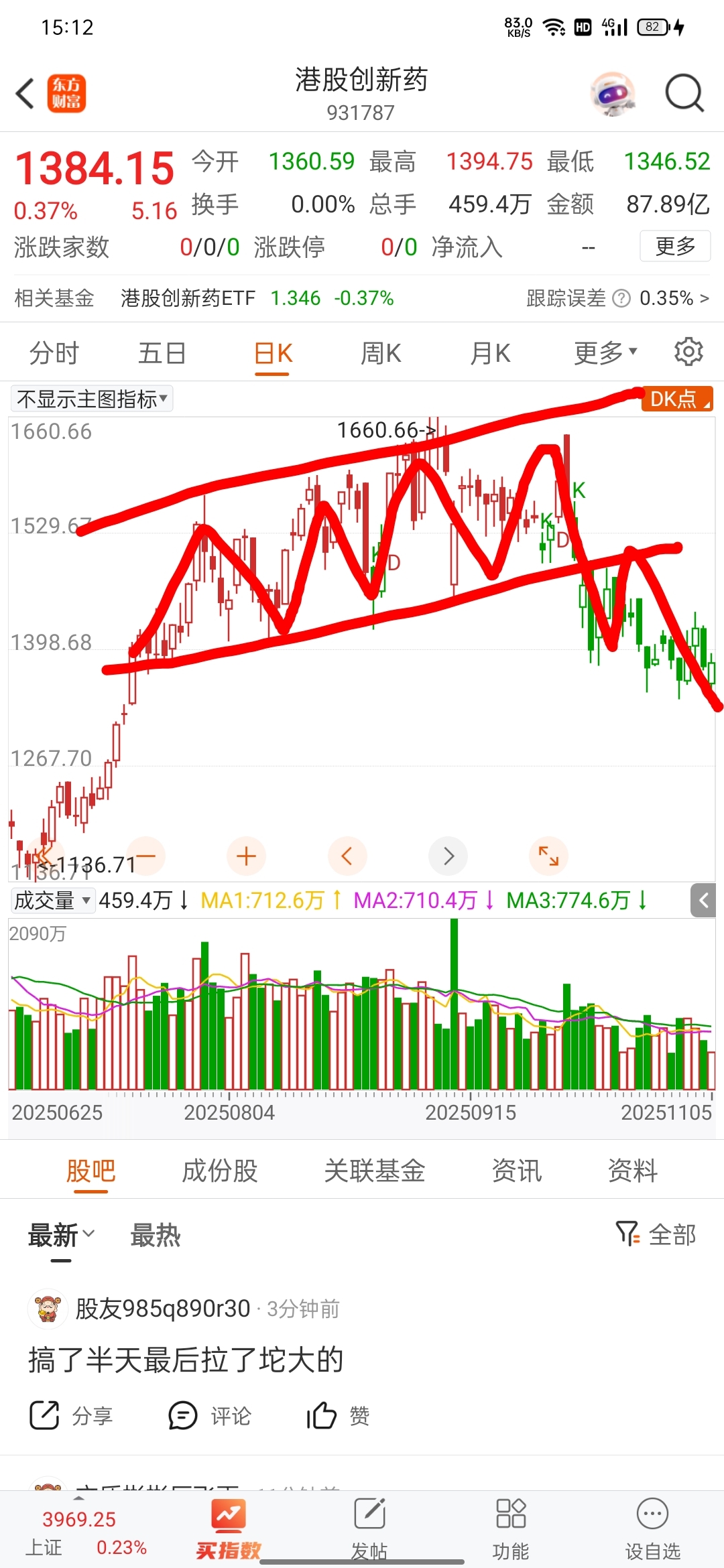 $恒生医疗保健指数(HS|HSHCI)$ $恒生生物科技指数(HS|HSHKBIO)$ $港股创新药(IS931787)$ 创新药大趋势下跌趋势了,居然还有人看好,幻想涨上去,上面三个月左右的头部结构,压力位重重,主力才布会去解放上面的套牢盘。