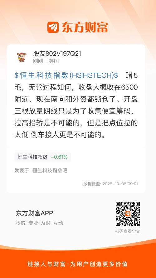 $恒生科技指数(HS|HSTECH)$ 赌5毛,无论过程如何,收盘大概收在6500附近,现在南向和外资都锁仓了。开盘三根放量阴线只是为了收集便宜筹码,拉高抬轿是不可能的,但是把点位拉的太低 倒车接人更是不可能的。