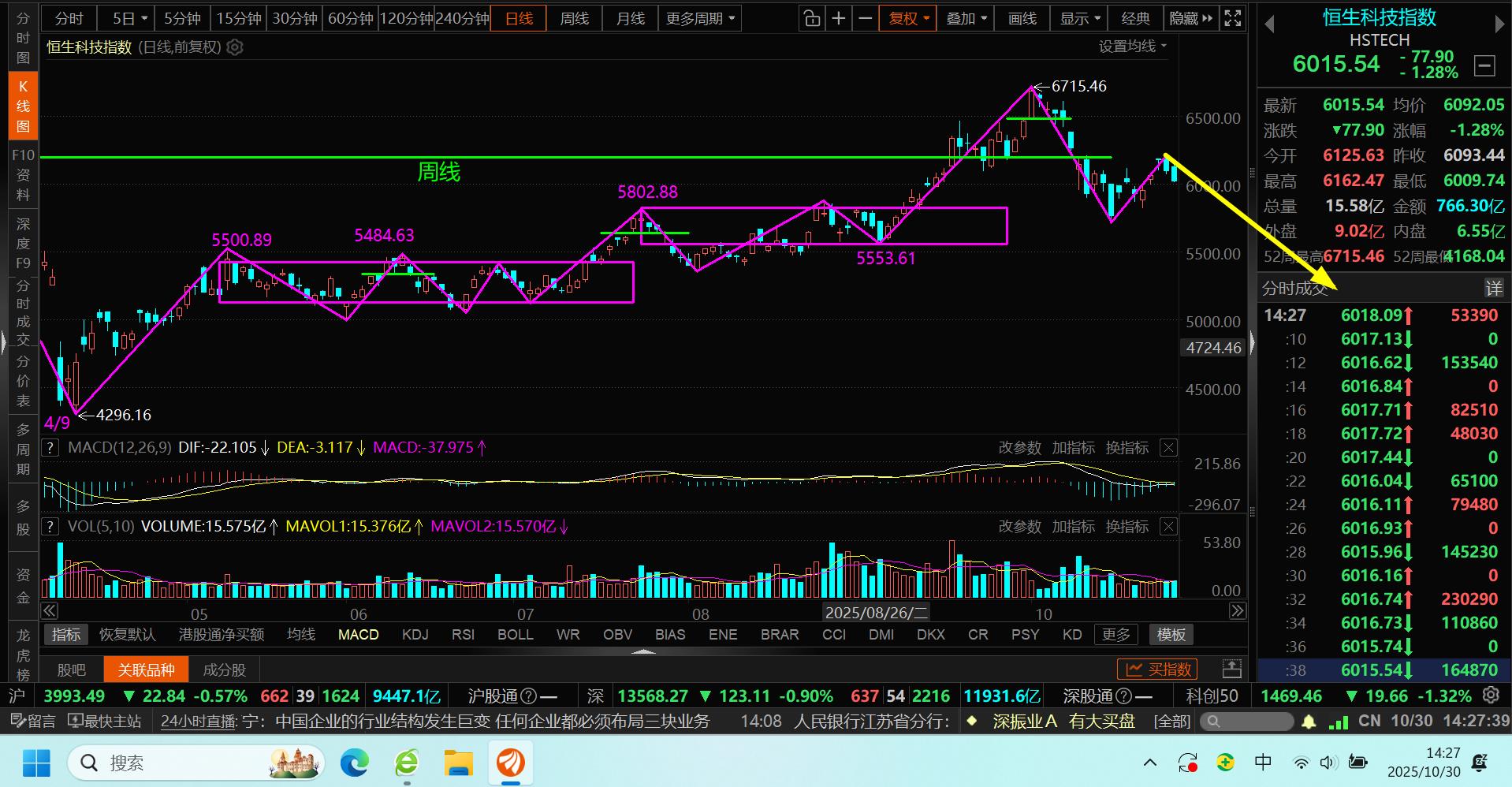 10月30日,周线级别杀跌段来了,快跑。恒生科技指数日线