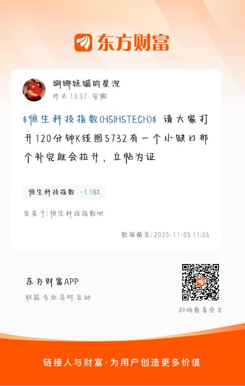 $恒生科技指数(HS|HSTECH)$  请大家打开120分钟K线图5732有一个小缺口那个补完就会拉升,立帖为证