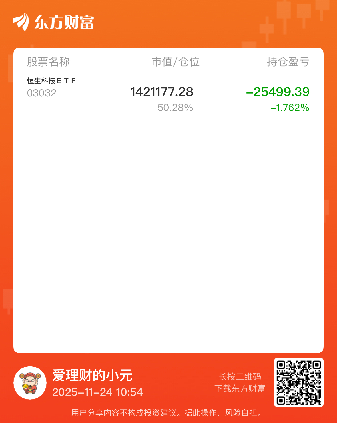 $恒生科技指数(HS|HSTECH)$ $恒生科技ETF(HK|03032)$ 150仓位,亏损1.8个点。跌继续加,涨就拿住