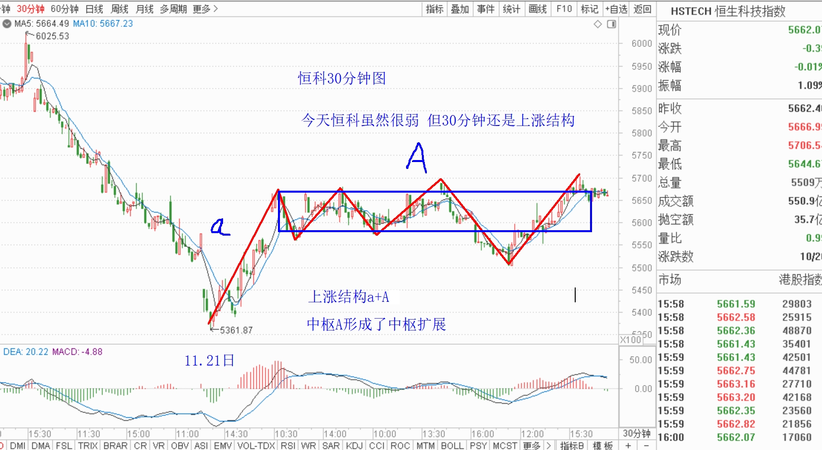 恒科日线走势虽然比较弱,但是30分钟11月21日以来还是上涨结构a+A。