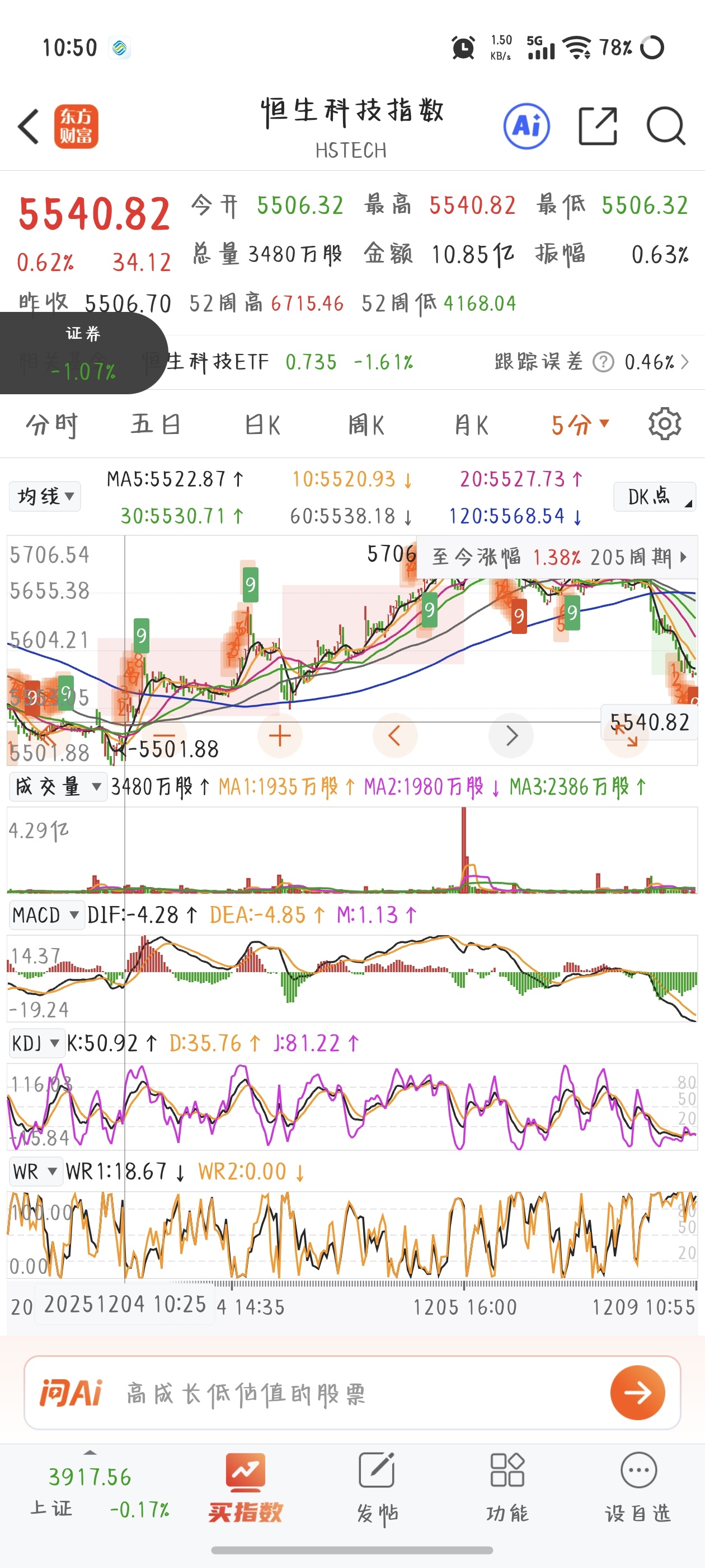 $恒生科技指数(HS|HSTECH)$ 补完一个缺口还有一个缺口 5540--5541左右仍然保留一个缺口,五分钟级别拉大可查看