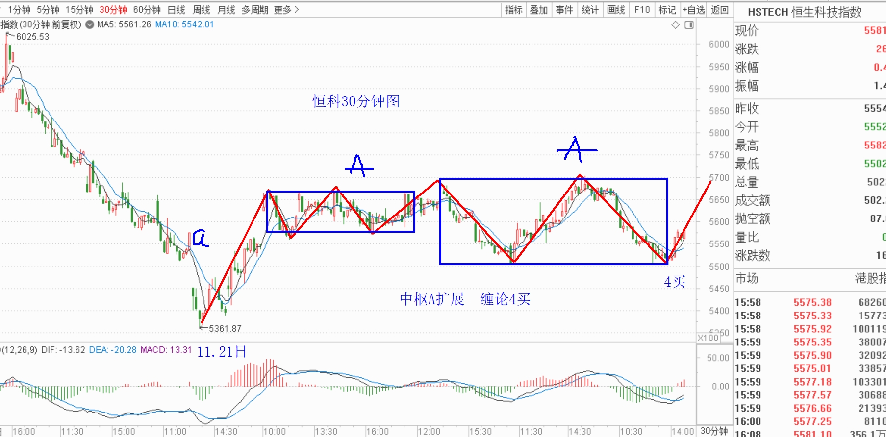恒科30分钟中枢扩展,11月21日以来走上涨结构a+A,12月3日跌破原来的上涨