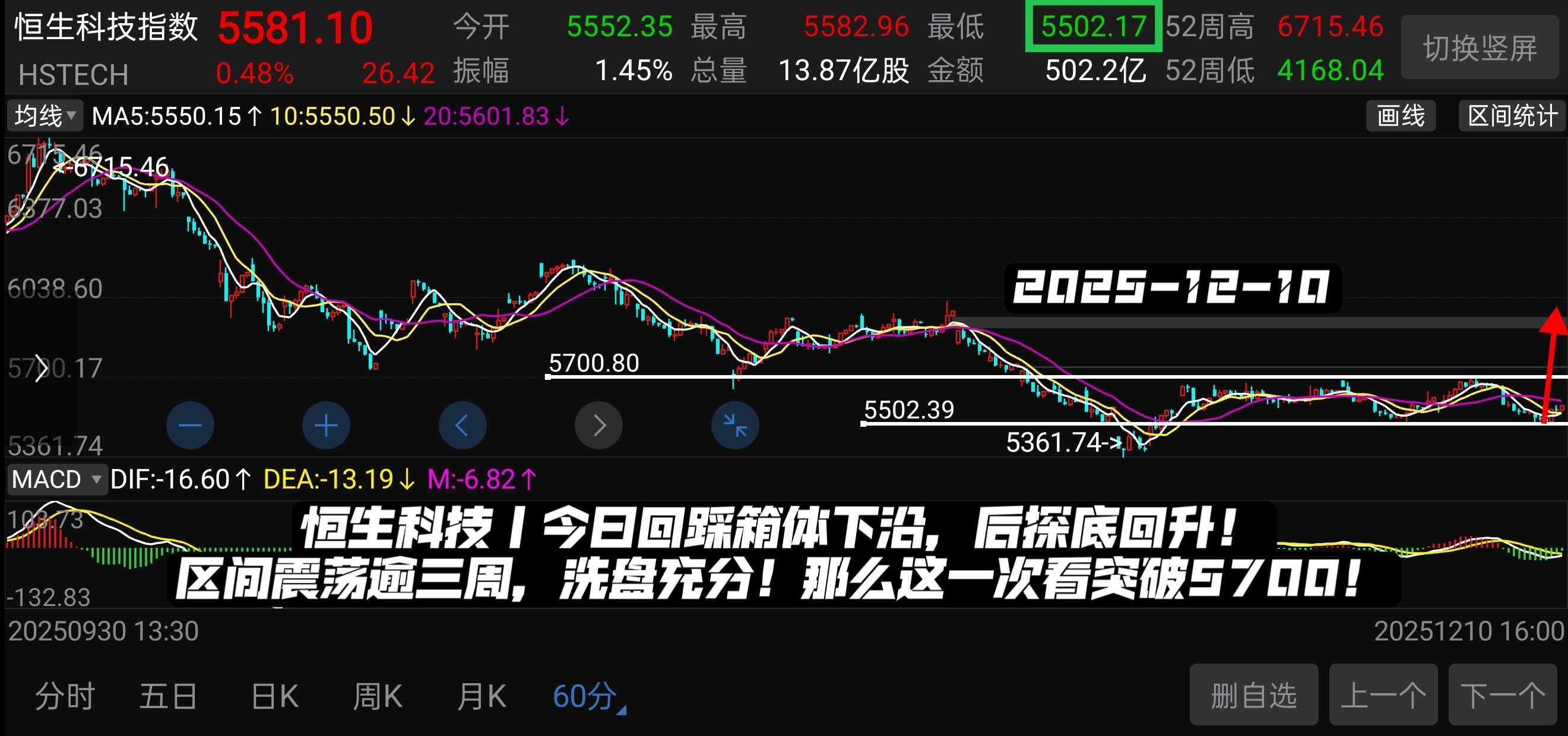 今天恒生科技丨最低打到5502,回踩5500-5700箱体下沿,后探底回升,尾盘翻红!看了一下,目前恒科区间震荡逾三周,时空蓄势充分!那么这一次,阿心看突破5700,开启牛市超级主升浪!春节前后看到7100点,观点不变。积极乐观……