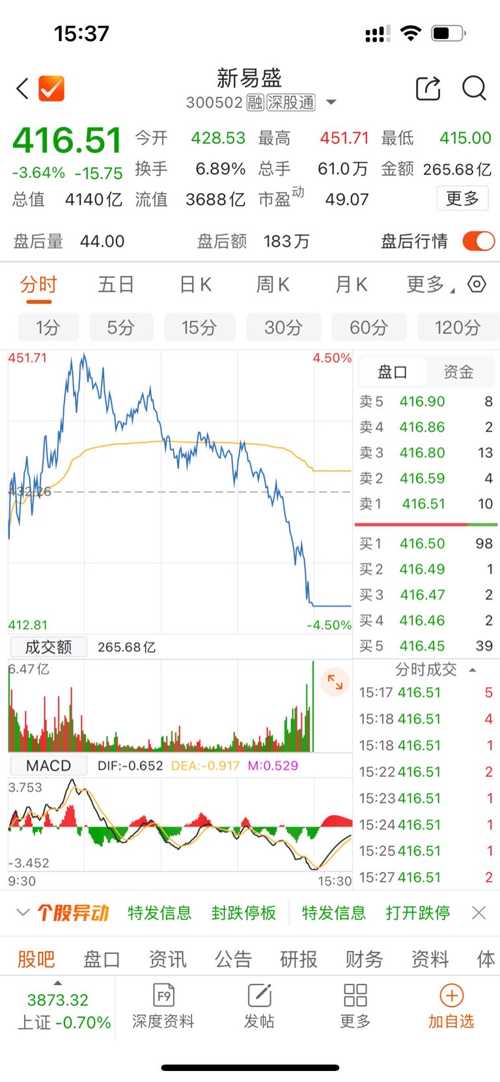 新易盛一天成交额都两百多亿将近三百亿。也就是说恒生科技指数里面所有的成分股加起来