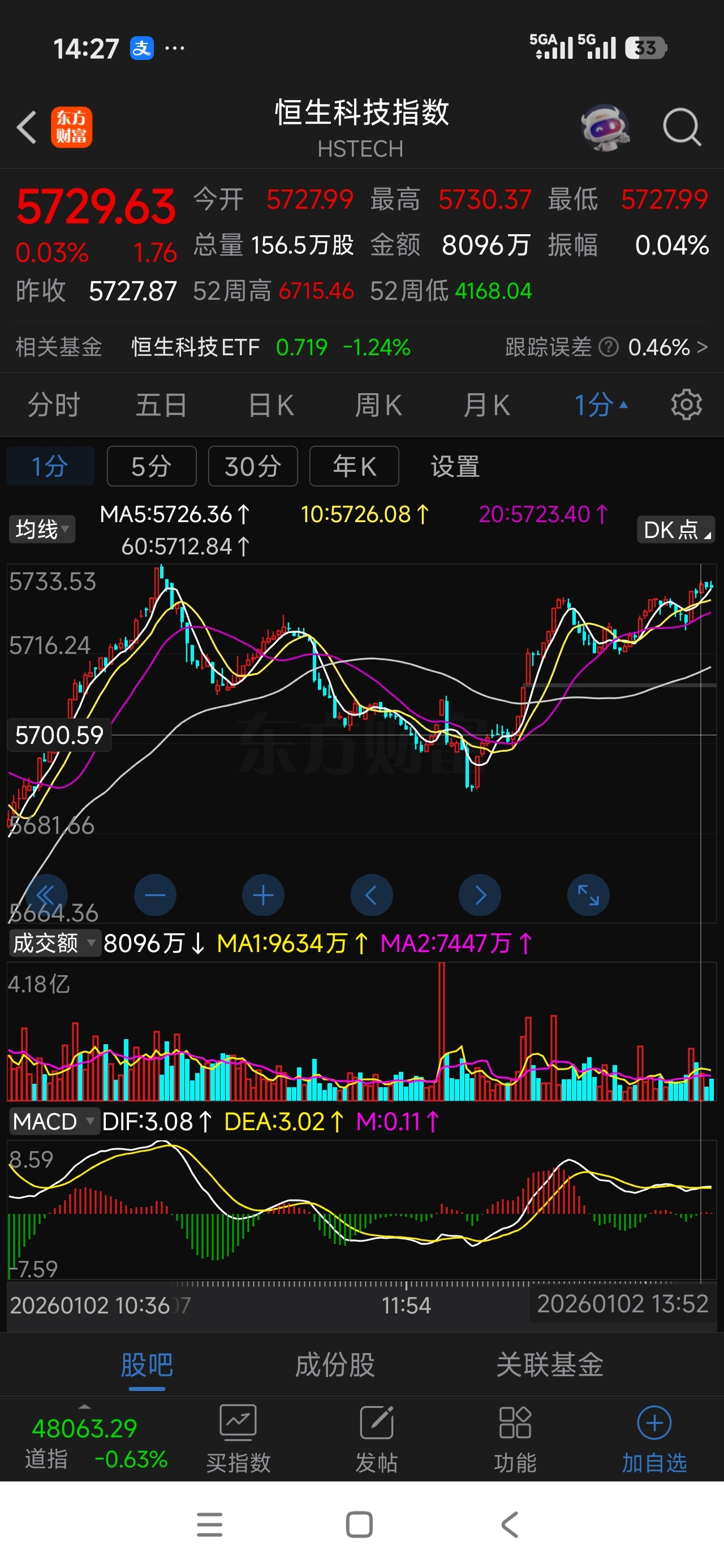 $恒生科技指数(HS|HSTECH)$ 这个1分钟图有问题最高点是 5753.28。