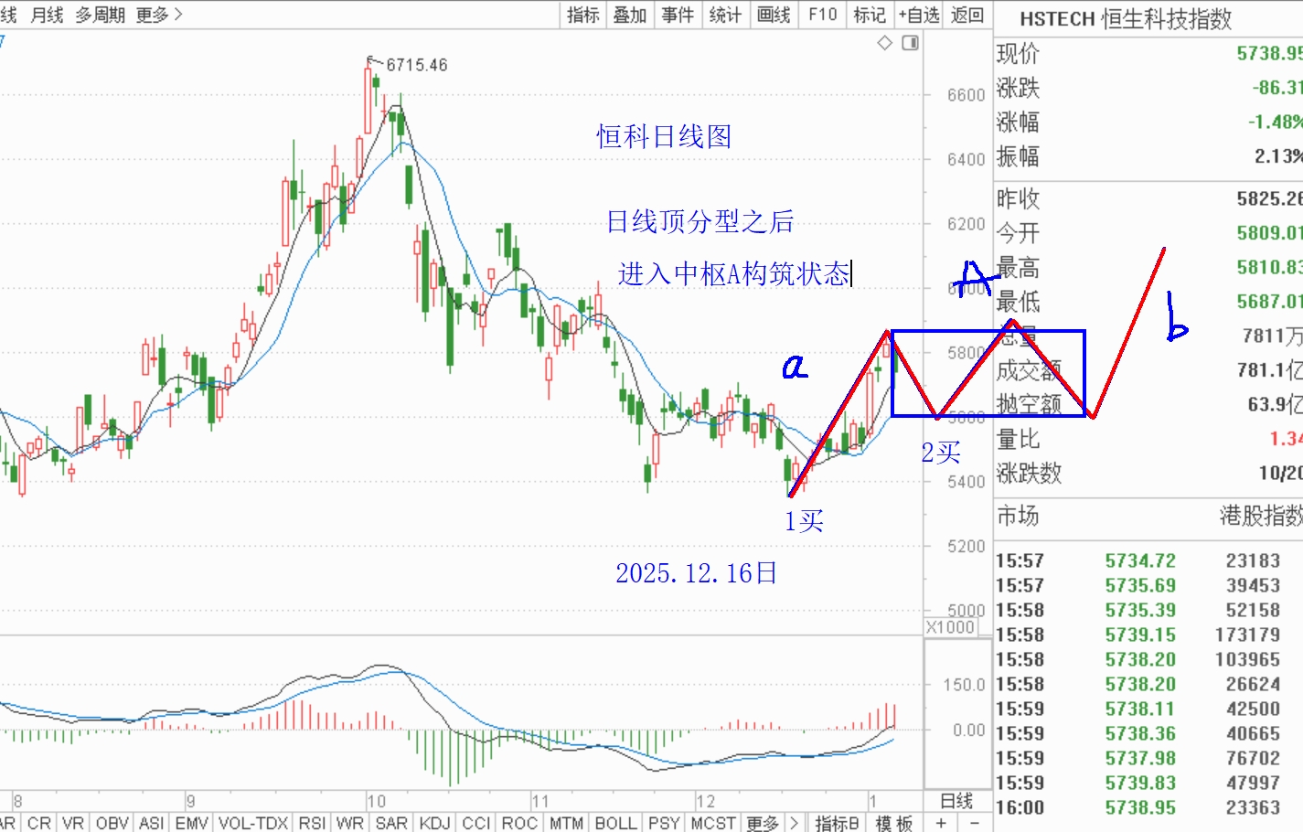 恒科日线图以2025,12,16日为分水岭,前面是下跌结构,后面可能要开启上涨结构a+A+b,今天日线形成顶分型,a可能结束了,进入中枢A构筑状态$恒生科技指数(HS|HSTECH)$