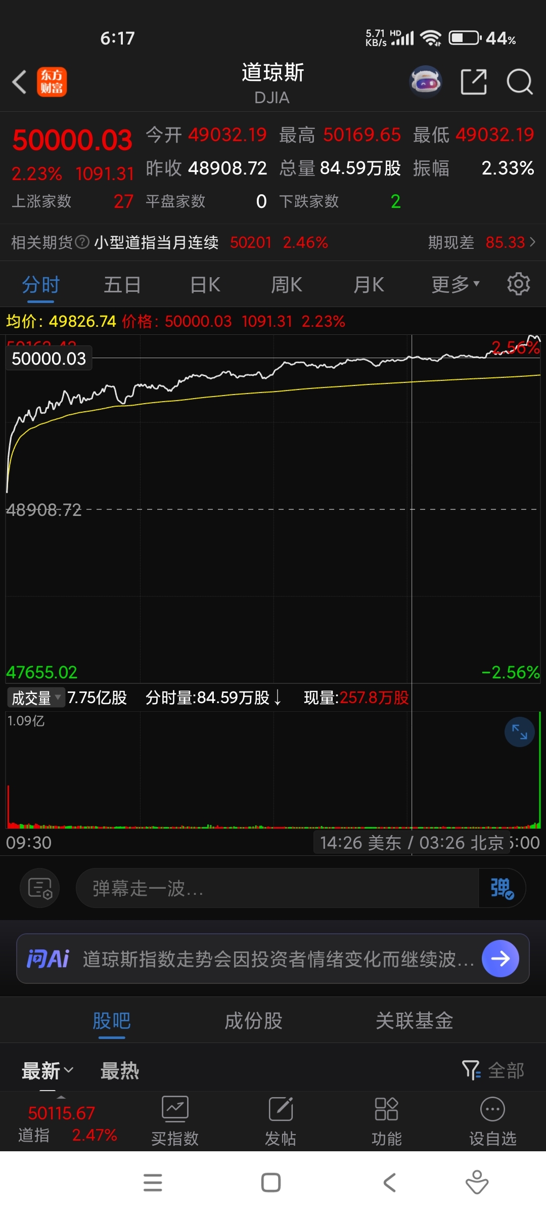 人生第一次遇到50000点的道琼斯指数。有幸见证历史。真羡慕啊。