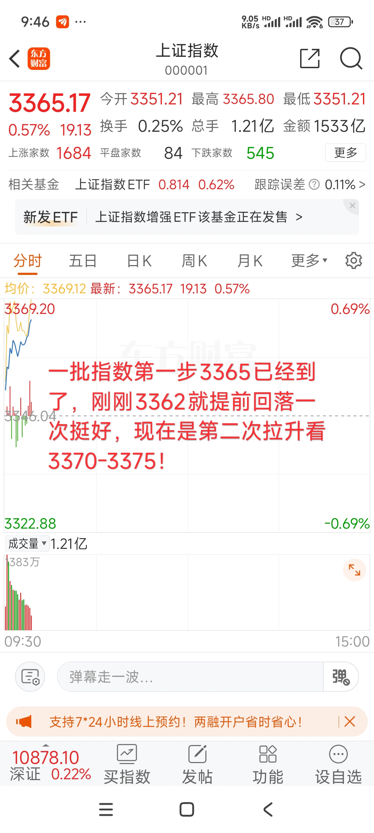 $上证指数(SH000001)$ 指数第一步3365已经到了,刚刚3362就提前回落一次挺好,现在是第二次拉升看3370-3375!