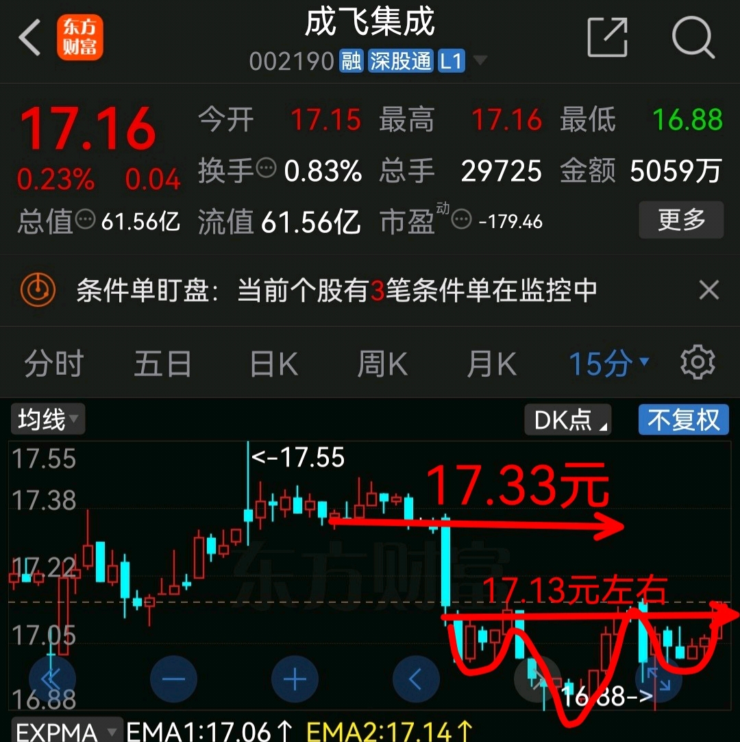 成飞今天15分钟图可以,头肩底形态,只要站稳17.13元左右,下午放量冲击一下1