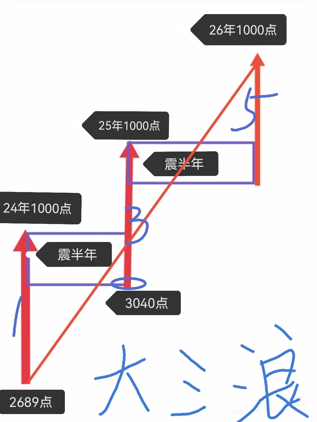 $上证指数(SH000001)$ 这是我目前能想到的大三浪最简单的图形了,每年上涨1000点只是我个人为了标注用的,预判会多点。