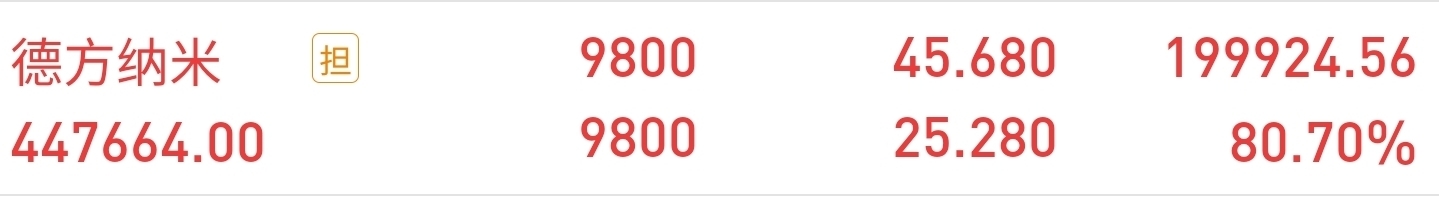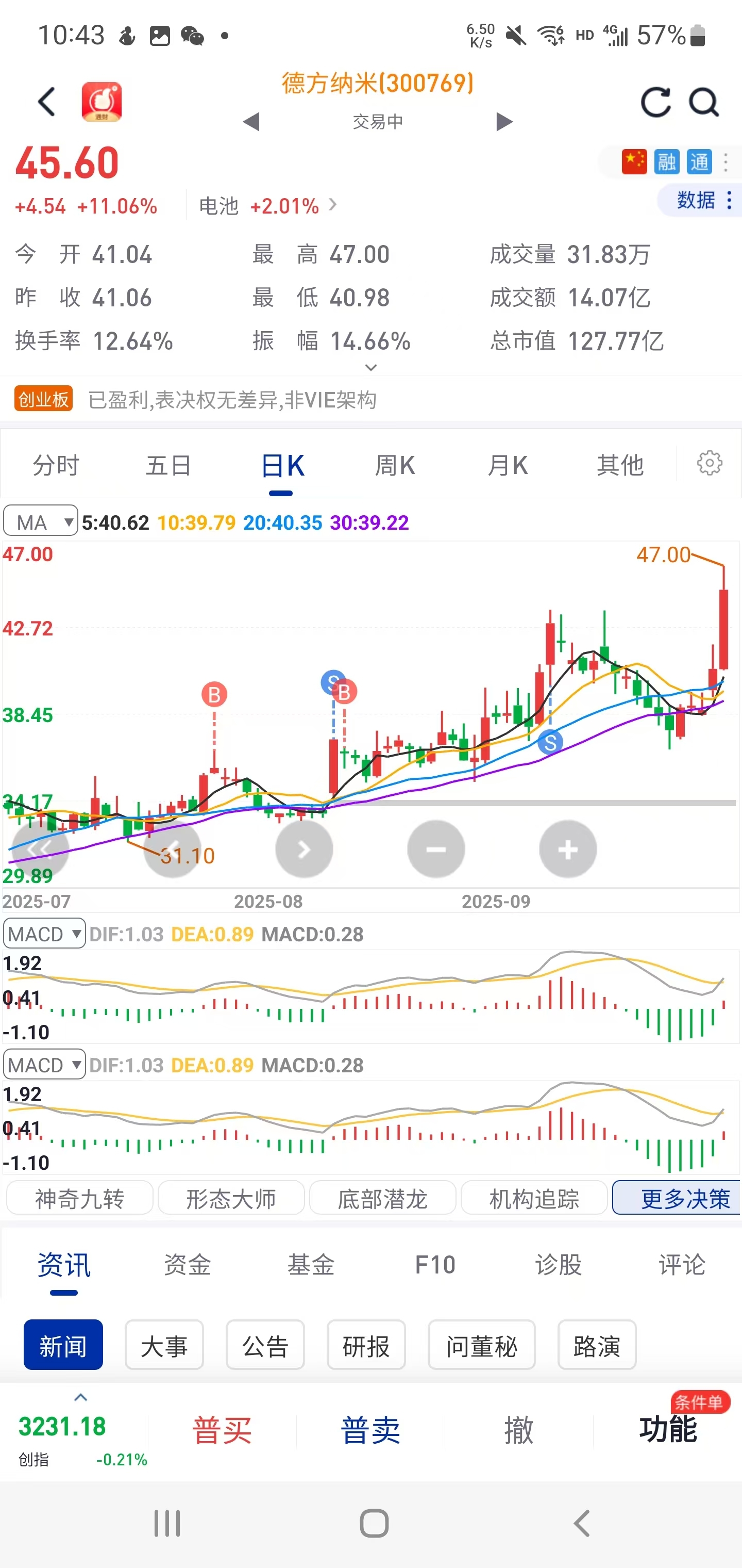 锂电在天际打出龙头标杆后,我切入德方纳米做补涨,去年10.8号高点52左右,我买入只做了一次减仓拿了两个月目前盈利不错。