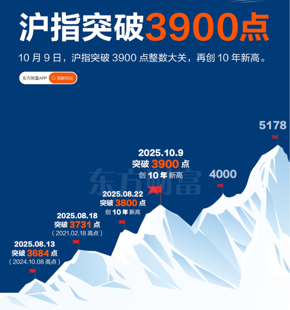 “十一”长假后的首个交易日,A股迎来了里程碑时刻。10月9日,A股三大指数高开高走,沪指突破3900点整数大关,刷新2015年8月以来新高。$东方财富(SZ300059)$ $中信证券(SH600030)$