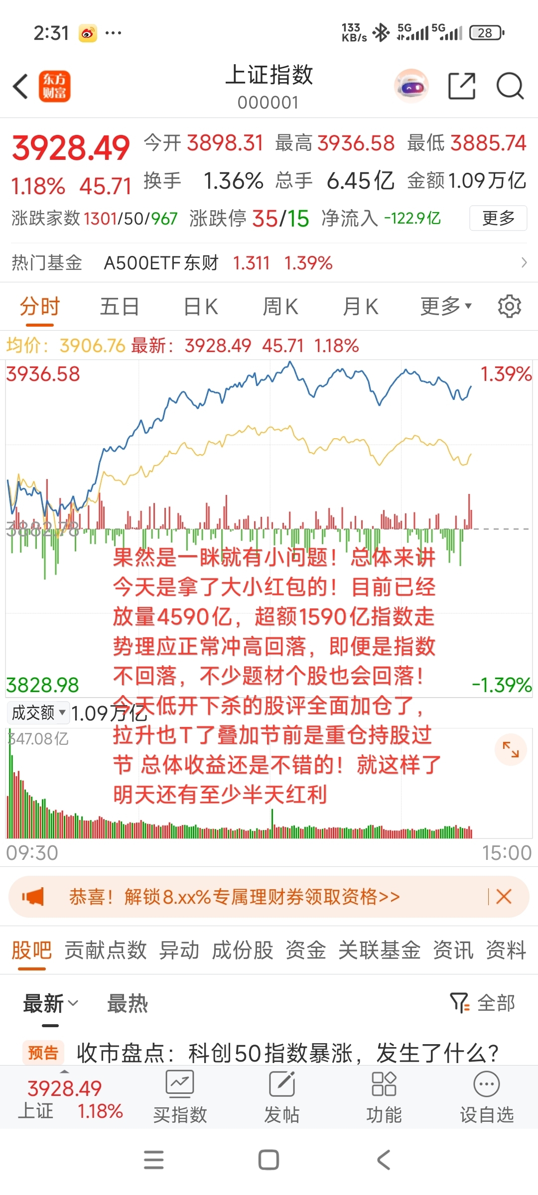 $上证指数(SH000001)$ 果然是一眯就有小问题!总体来讲今天是拿了大小红包的!目前已经放量4590亿,超额1590亿指数走势理应正常冲高回落,即便是指数不回落,不少题材个股也会回落!今天低开下杀的股评全面加仓了,拉升也T了叠加节前是重仓持股过节 总体收益还是不错的!就这样了明天还有至少半天红利