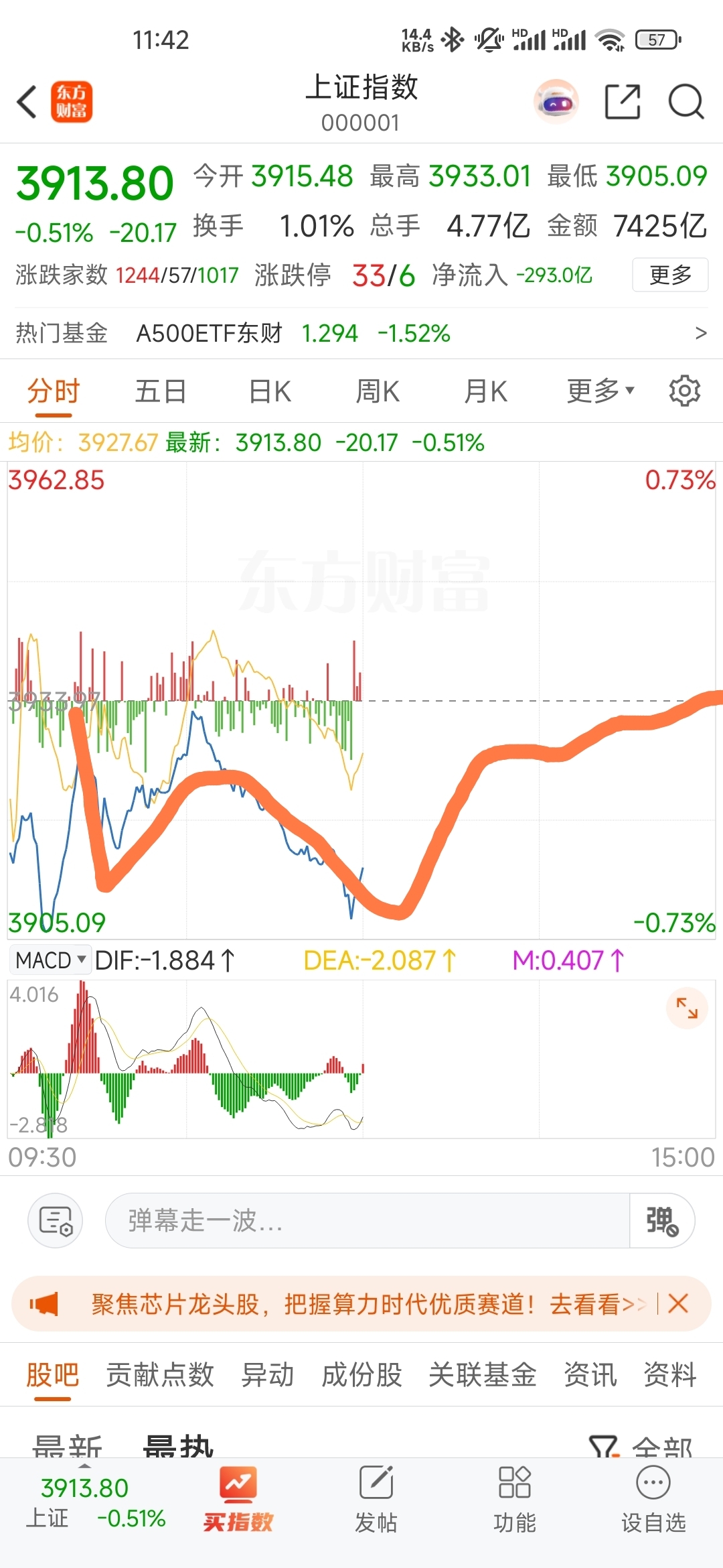早盘三大指数低开低走,盘中没反弹无力,空头目标在3900点。黄上白下,权重压盘,个股全线反弹。两市略缩量成交17000亿,相比节前半天时间缩量了500亿。截止上午收盘3000家上涨,2300家蓄势待涨。跌停家数有10家,而涨停的也有60多家。红多绿少, 大家喜欢几家发愁。早盘手上股票低开的低吸,做个差价还是不错的。当然你不敢出手,那就多看看,稍安勿躁!看云起云落。十月围城持风景!
