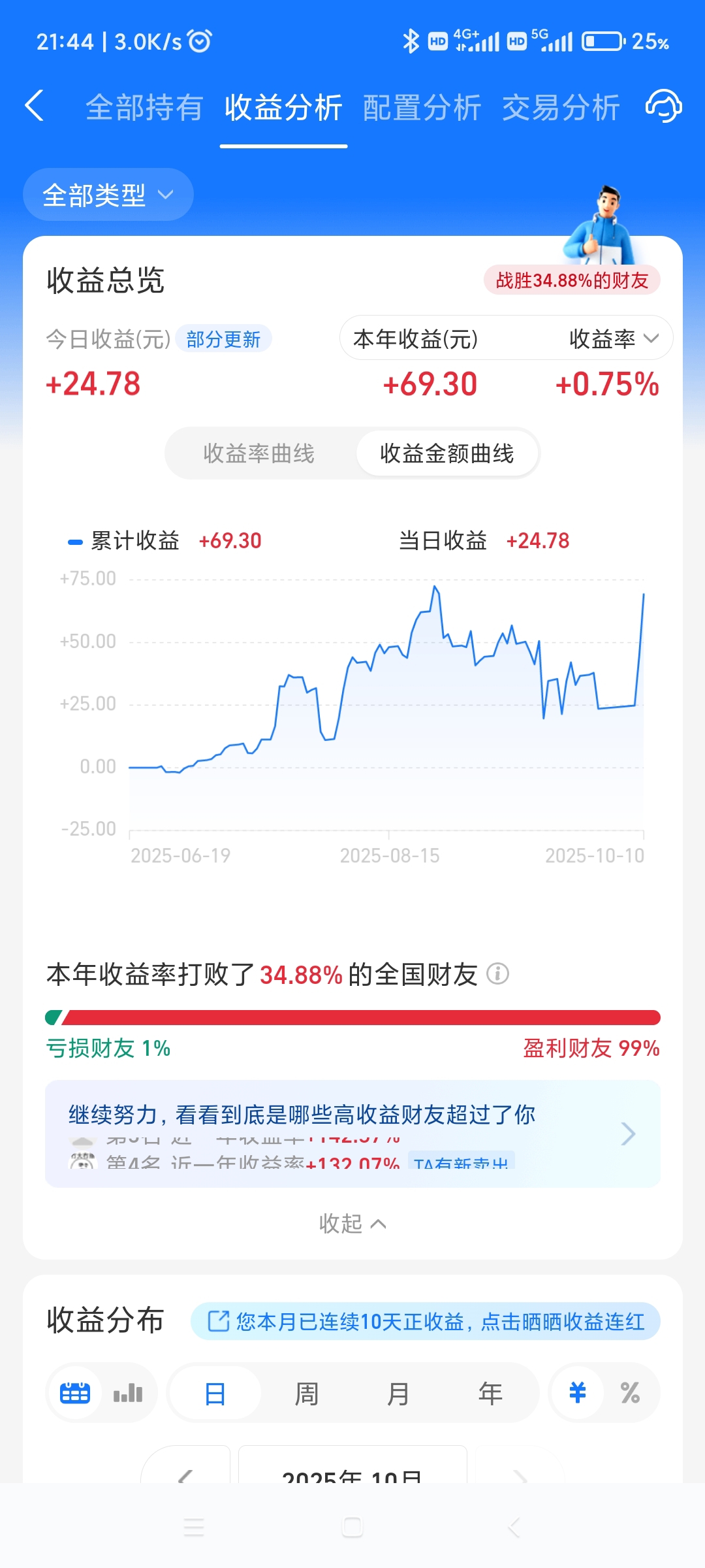 [251010]理财第51天,今天赚了+24.78元,累计盈利69.30。今天的