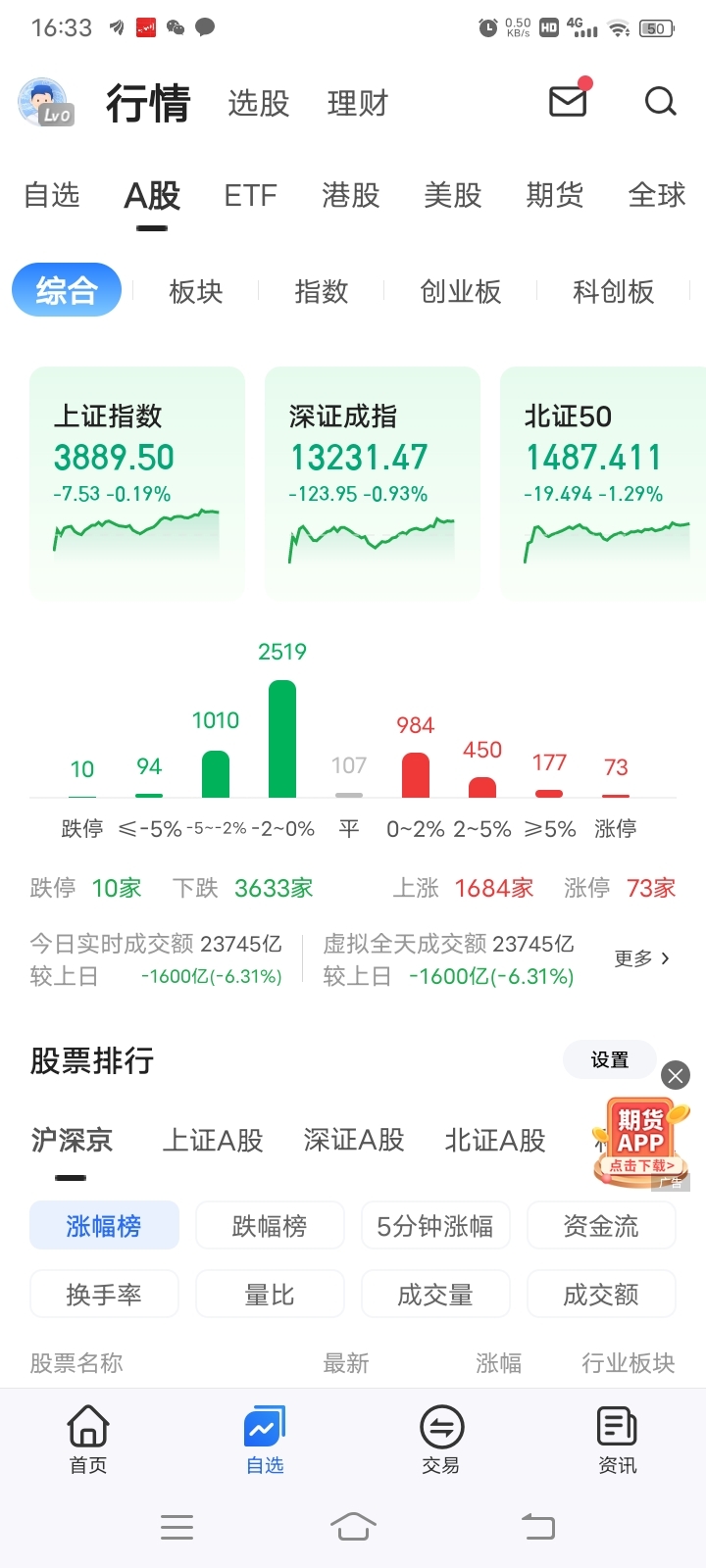 今日A股上涨1684家,其中涨停73家。下跌3633家,跌停10家